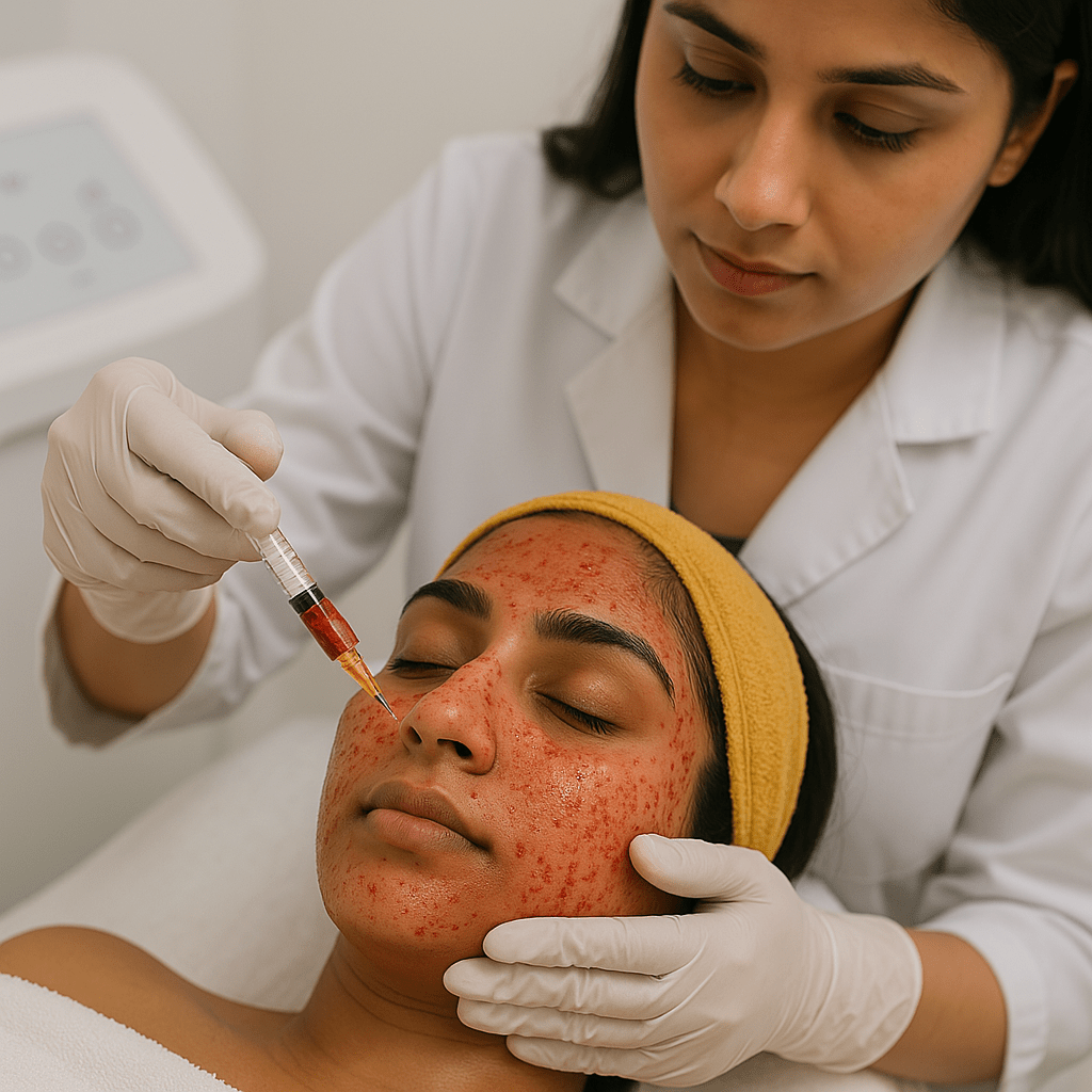 Microneedling + PRP Application: Tiny needles create microchannels in the skin while PRP is applied, boosting healing and regeneration.